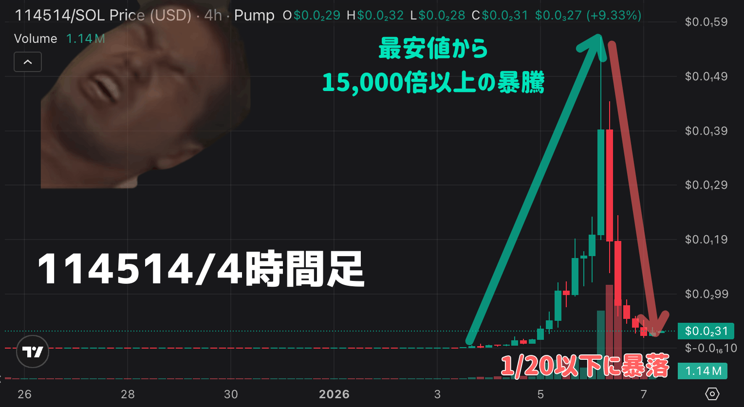 最大15,185倍という驚異的な上昇を見せた『114514』というコイン(暗号資産)が話題となっています。名前からピンときた方もいるかもしれませんが、これはネットミームとして有名な『真夏の夜の淫夢(通称:淫夢※)』をネタにしたジョークコインです。