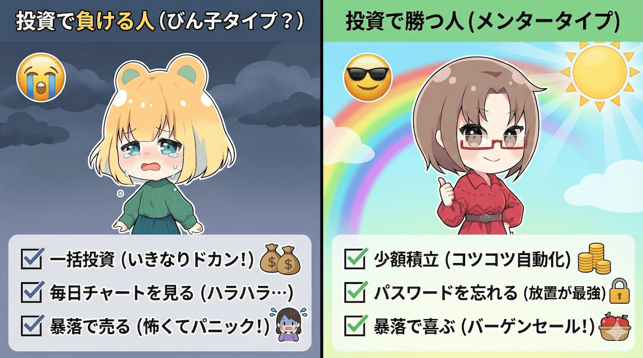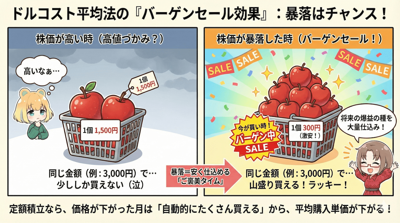 ✔︎円高になったら:「えっ、じゃあ円高になったら損じゃん」と思いましたか? 違います。積立投資にとっては『バーゲンセール(仕込み時)』になります。基準価額が下がるので、同じ3,000円でも『たくさん口数を買える』ボーナスタイムになるのです😤
