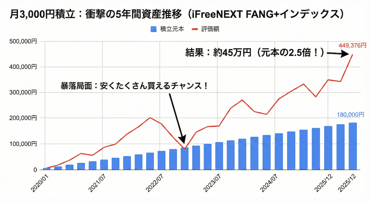 まずは、四の五の言わずに結果を見てください。過去5年間(2020年〜2025年)、米国のテックジャイアントに投資する『iFreeNEXT FANG+インデックス』という指数に実際に積み立てた場合のシミュレーションです。