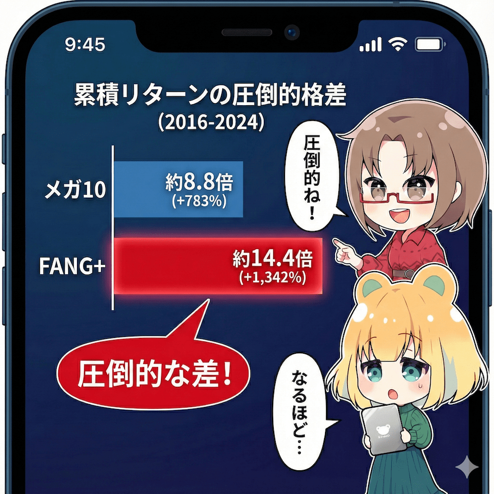 これが『入れ替え力』の差です。メガ10の『8.8倍』も素晴らしい成績ですが、FANG+の『14.4倍』は次元が違います。