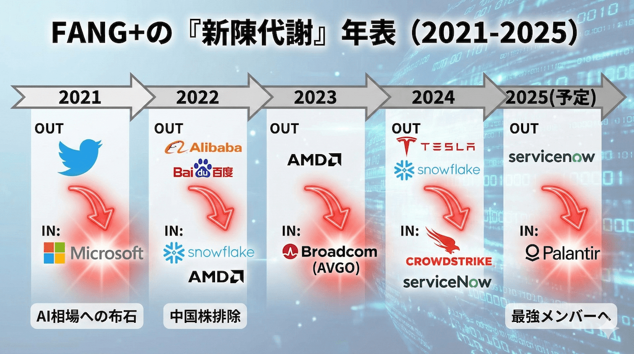 まず、FANG+の『新陳代謝』の歴史を見てみましょう。この指数は、単なる固定メンバーの仲良しクラブではないことがわかります。