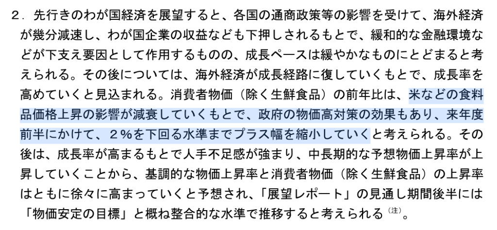 さらに、足元のコアCPI(生鮮除く)が3%程度にあるとしつつも、米国の穀物相場下落や政府の政策効果により、来年度前半には一時的に2%を下回る『山型』の物価シナリオを提示しています。(画像参照👇)