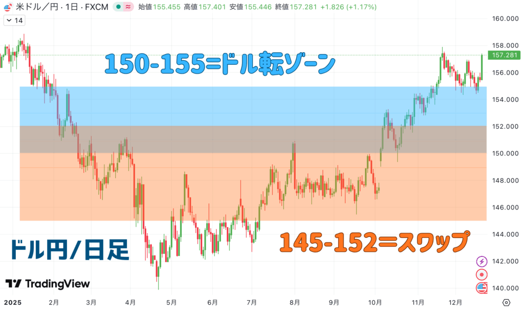 スワップ投資であれば、145〜152円レベルで段階的に拾えると強いでしょう。特に148円以下で拾えた場合には、かなりのお宝ポジとなる可能性があります。