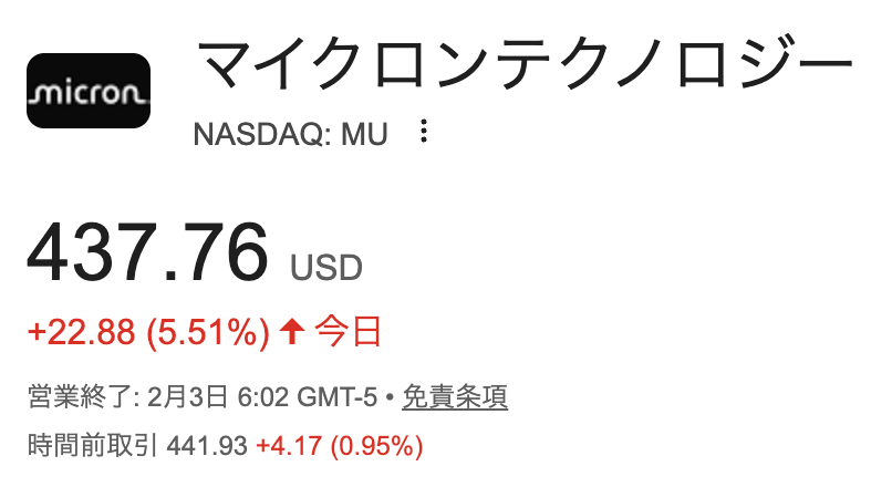 そして、マイクロン・テクノロジー(MU)は相変わらず絶好調😤 昨夜のプレマーケット(時間前取引)で401ドルをつけ、今日のプレでは450ドルを伺う展開。昨日買うだけで+10%だったっていう。