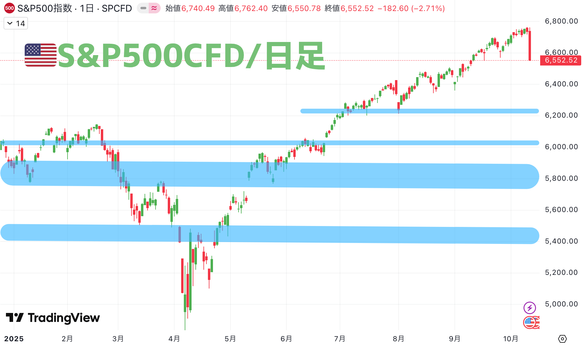 ここで下げ止まらない場合は、4月の再来ですね。VIX指数が40を超えた場合などは、▲20%の下落、5,400〜5,500ポイントで厚めに拾えるような資金管理をしたいところでしょう。