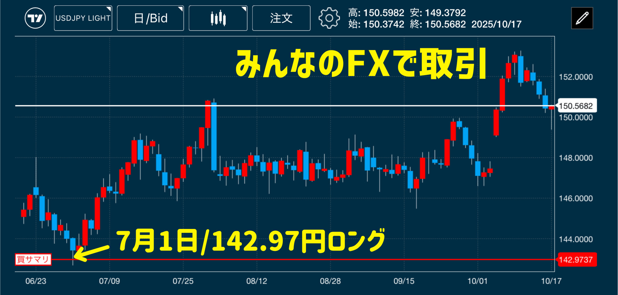 7月1日にロングしたスワップポジションは4ヶ月目に突入しそうです。2万通貨で為替差益+14万円、スワップポイントが+4万円の計+18万円です。こういったトレードが10〜15万円程度の少ない資金でできるのがFXの魅力です。
