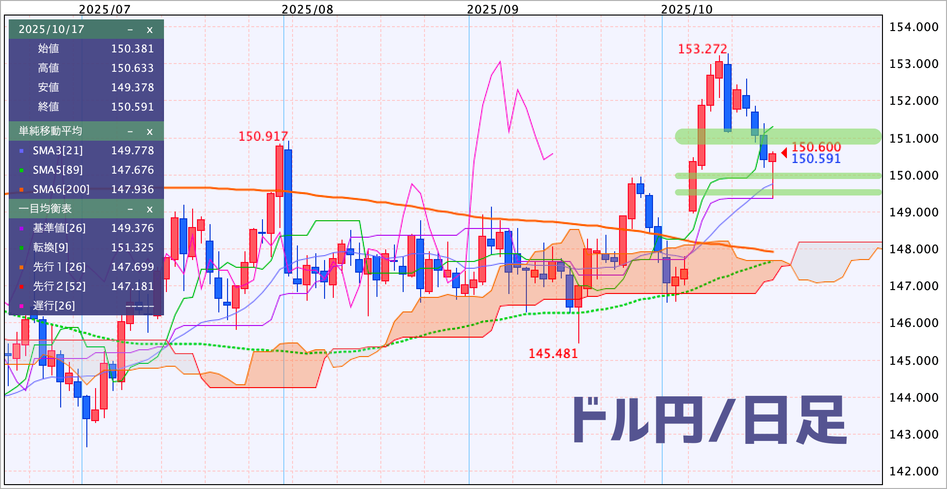 基本的には150円前後を挟んでのレンジが続きそうです。想定レンジとしては、概ね149.80〜151.80円を考えていますが、地銀懸念が再燃した場合、株価が急落する場合は下抜けも十分あるでしょう。日本の政局問題なども絡んできますが、やはりなんだかんだの円売りは根強いと考えます。先週は一旦、高市トレードの巻き戻しなどで円買いが入りましたが、21日の首班指名へ向けては、高市首相誕生ムードで円売りとなりそうです。