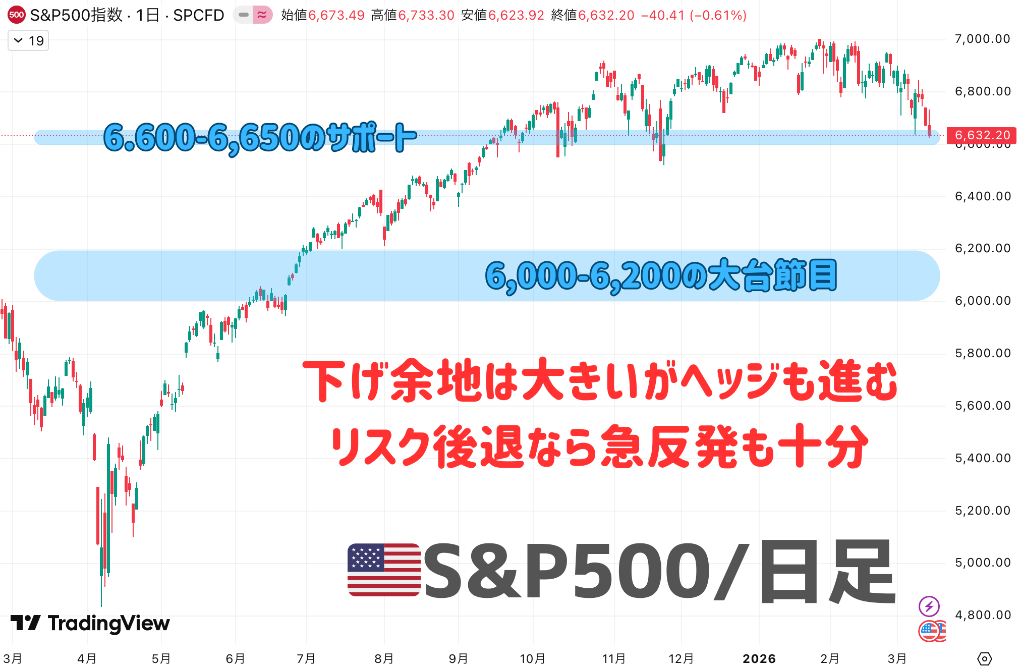 🇺🇸S&P500:6,500~6,900のレンジ。極端なタカ派サプライズがなければ下押しを吸収。