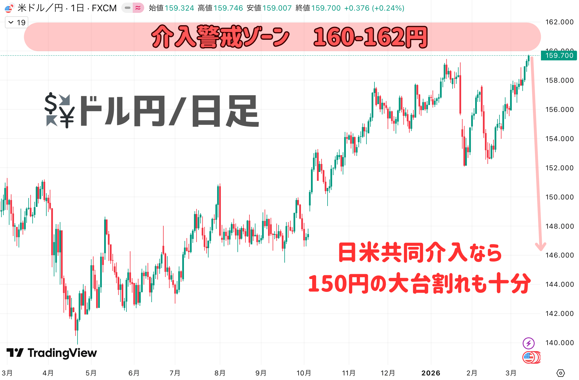 いま最も激アツなのが為替市場です。3月13日には159.43円まで売られ、ついに『160円』が目前に迫りました。