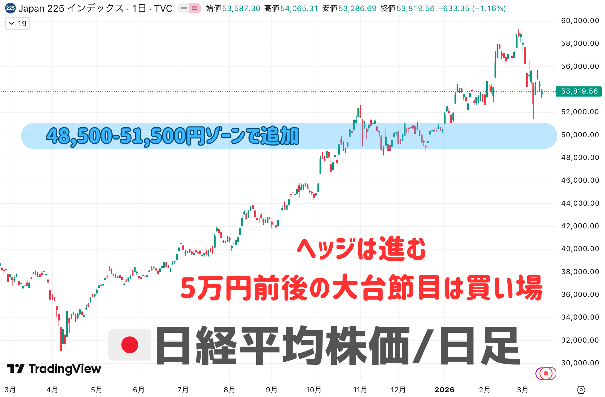 3月13日の日経平均終値は53,819.61円。3月2日の58,057.24円から短期間で猛烈に調整しています。