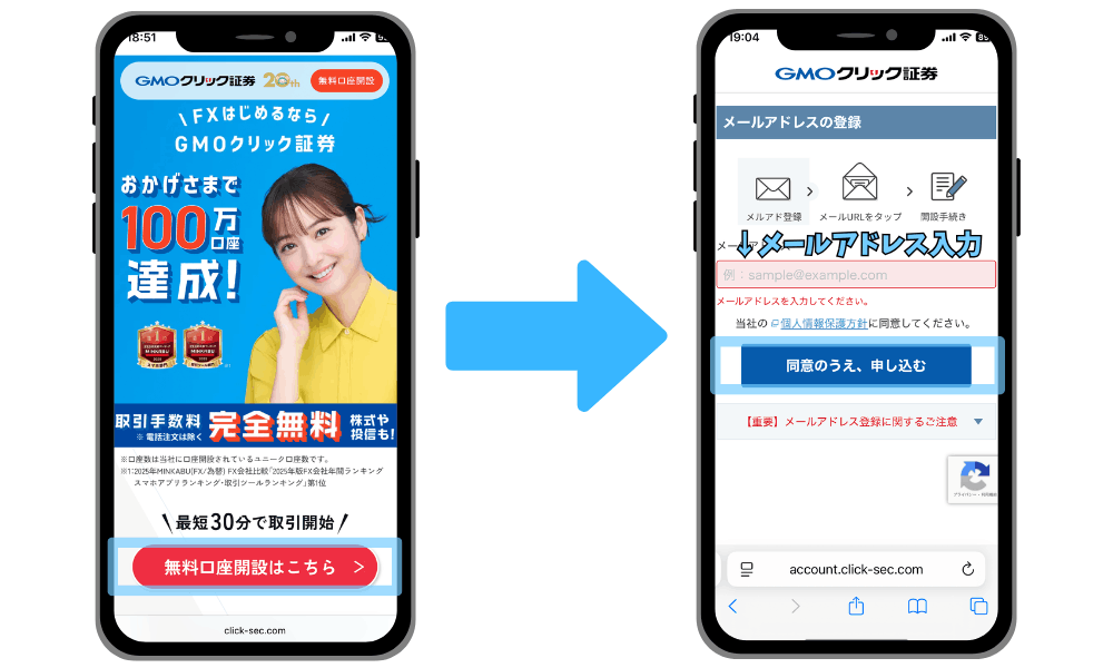 ①バナーをタップし【無料口座開設はこちら】→メールアドレスを登録します。