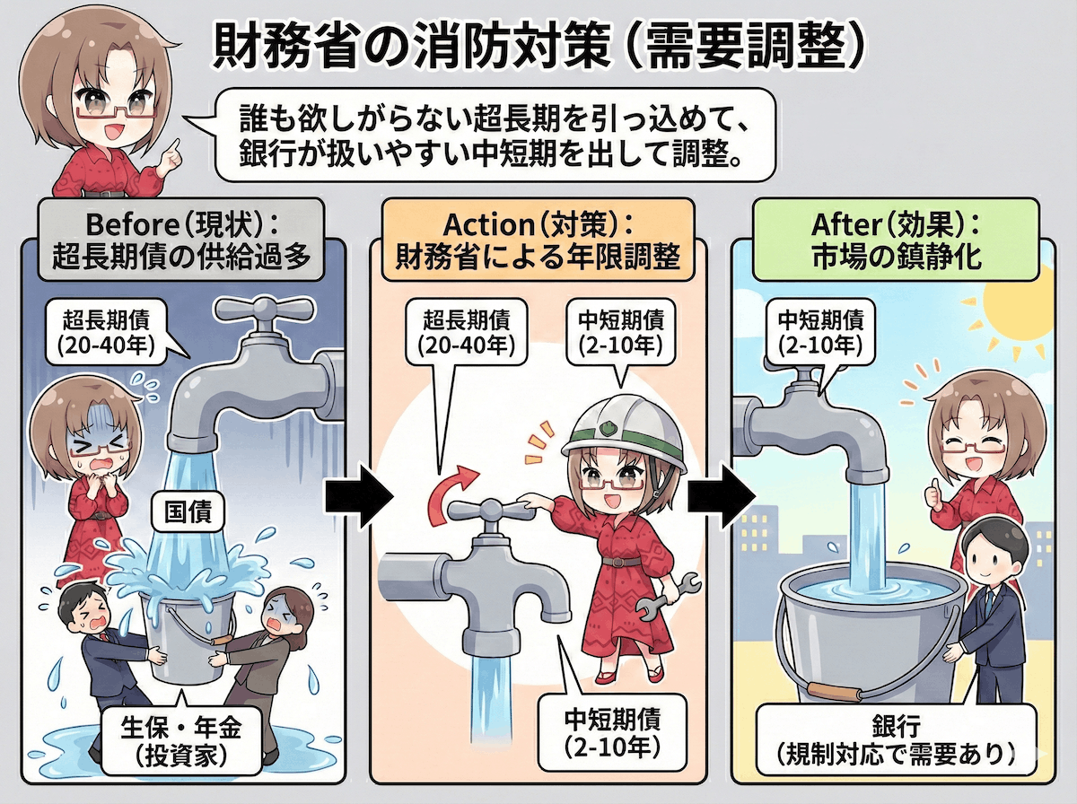 つまり、『誰も欲しがらない超長期を引っ込めて、銀行が扱いやすい中短期を出す』ことで、市場をクラッシュさせずに落ち着かせる……という『需給の配置転換』です。これが最も現実的かつ、副作用の少ない安定化策と言えます。