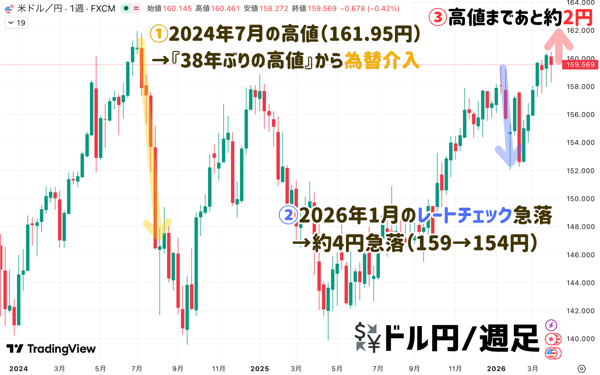 まず、今の相場環境を整理しておきましょう。ドル円は159円台で推移中です。2024年7月につけた約38年ぶりの高値(161.95円)まであと約2円。NY原油(WTI)は1バレル=100ドル超え、中東のイラン情勢は流動的で、原油高を背景にした円安圧力は当面続くと見られています。