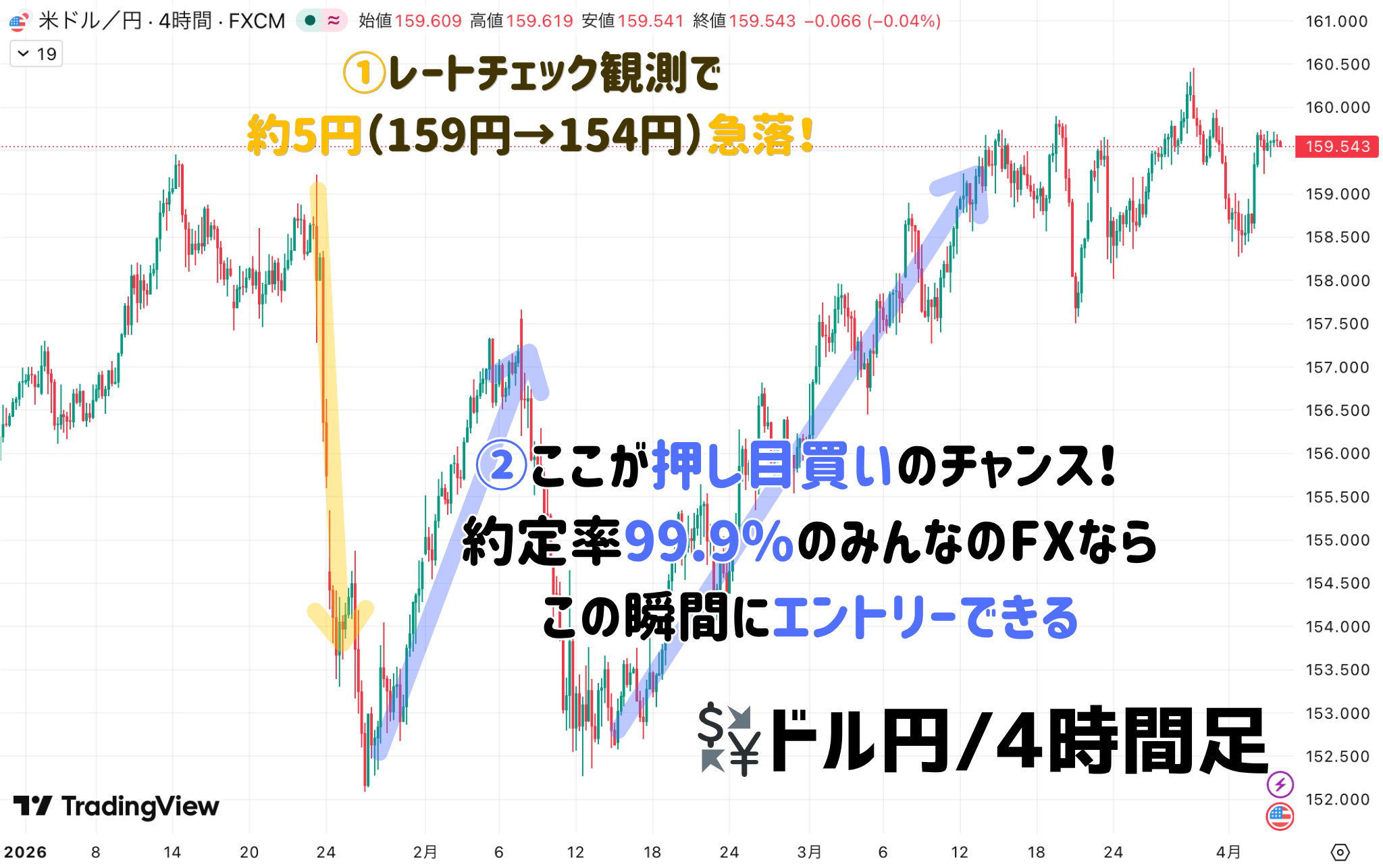 ⭕️2026年1月の実例:ドル円が159円台→レートチェック観測→154円台まで約5円急落。その後、再び160円方向に戻す展開でした。もし154円台で拾えていたら、為替差益だけで5万円(1万通貨)、さらに毎日スワップ収入が加算されます。