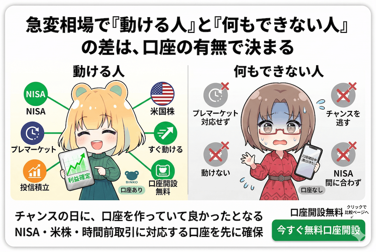 いざという時に動けない機会損失を防ぐためにも、まずは口座を開設し、少額からでも『市場に居続ける』準備を始めましょう👇
