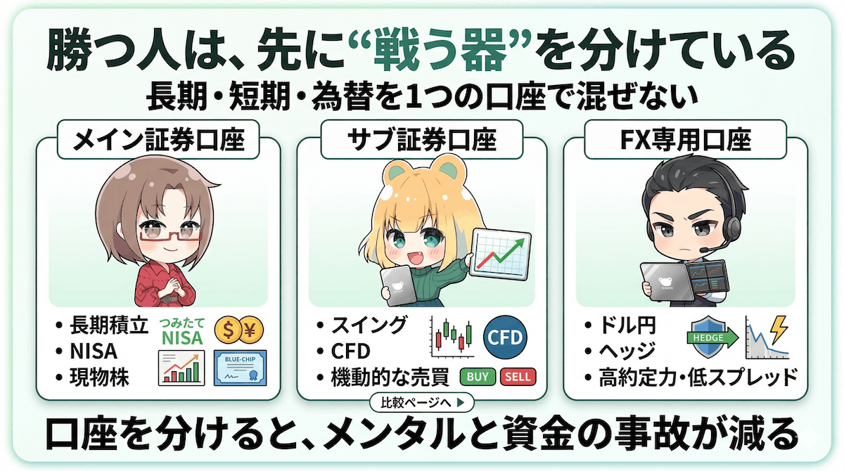 🔸メイン証券口座:長期積立、NISA、コアとなる現物株用🔸サブ証券口座:短期スイングトレードや、CFDなど総合口座