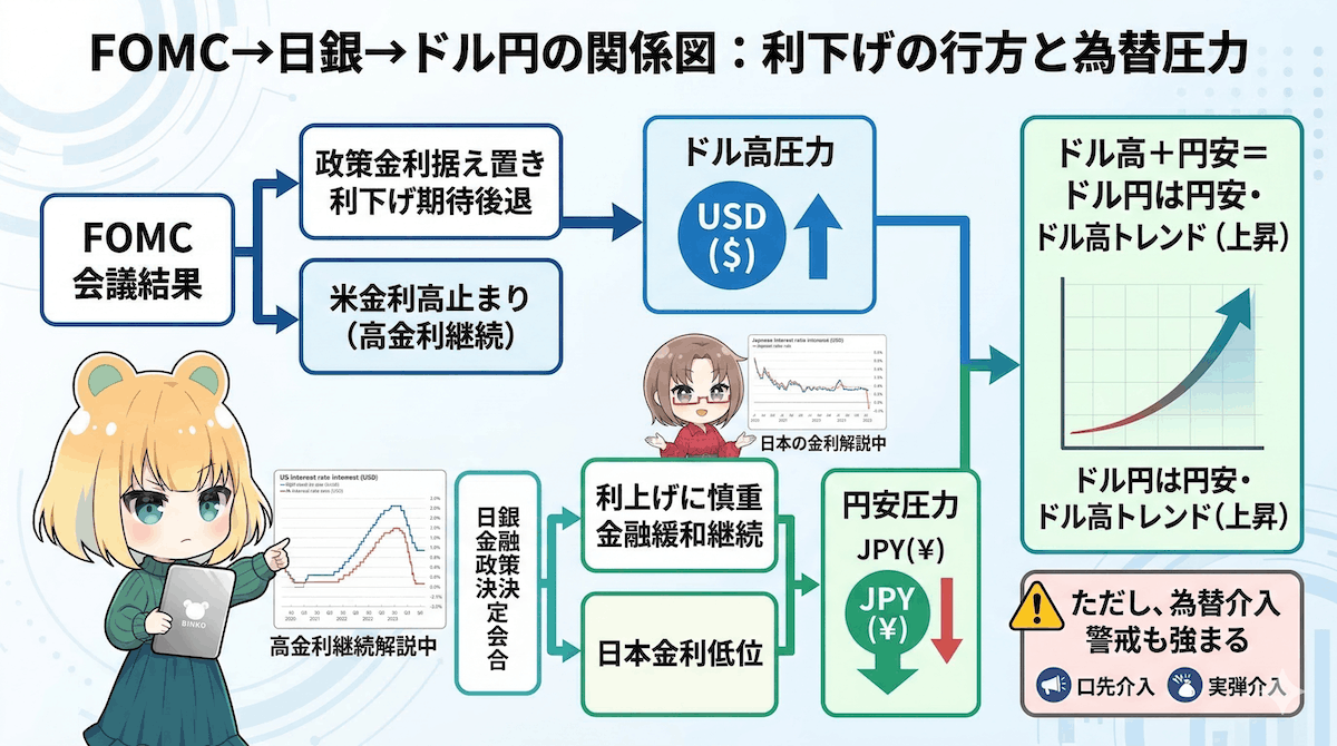 こうした日米の金融政策の差(米国は利下げせず、日本も利上げせず)を背景に、現在のドル円相場は1ドル=160円近辺という歴史的な円安水準で推移しています。