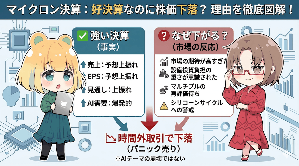 マイクロンは、スマートフォンやパソコン、そしてAI(人工知能)サーバーに欠かせない『メモリー半導体』の世界的大手です。AIブームの恩恵を直接受ける企業として、多くの投資家が期待を寄せていました。