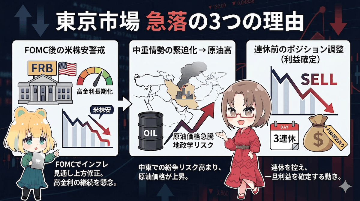 まずは、今日なぜこれほどまでに株価が下がったのか、その背景を整理しましょう。理由はシンプルに以下の3つが重なったからです。