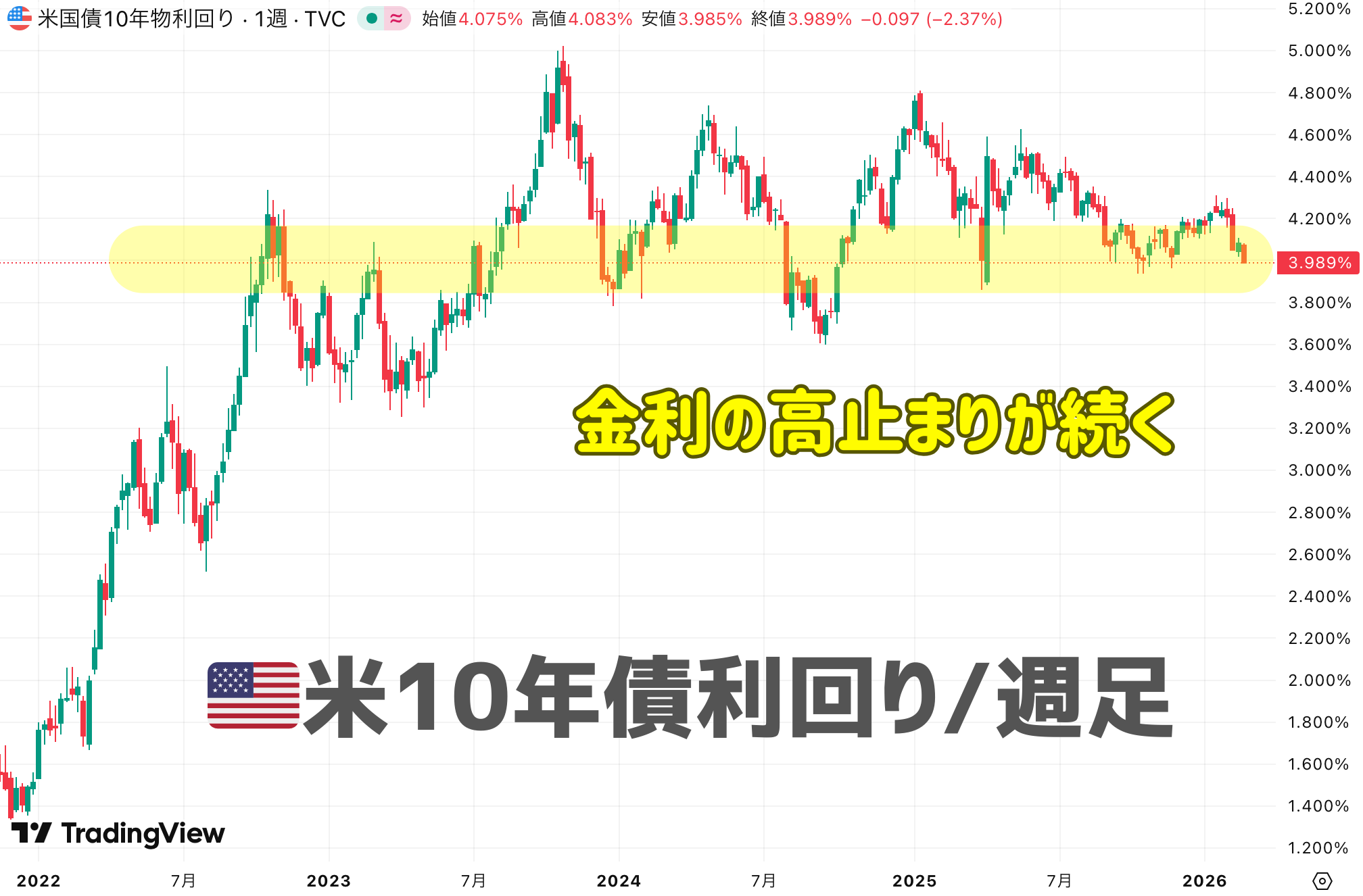 米金利は『いずれ下がる』と予測されながらも、米長期金利(10年債利回り)は2022年から現在に至るまで、ほぼ4%前後の高水準を維持しています。