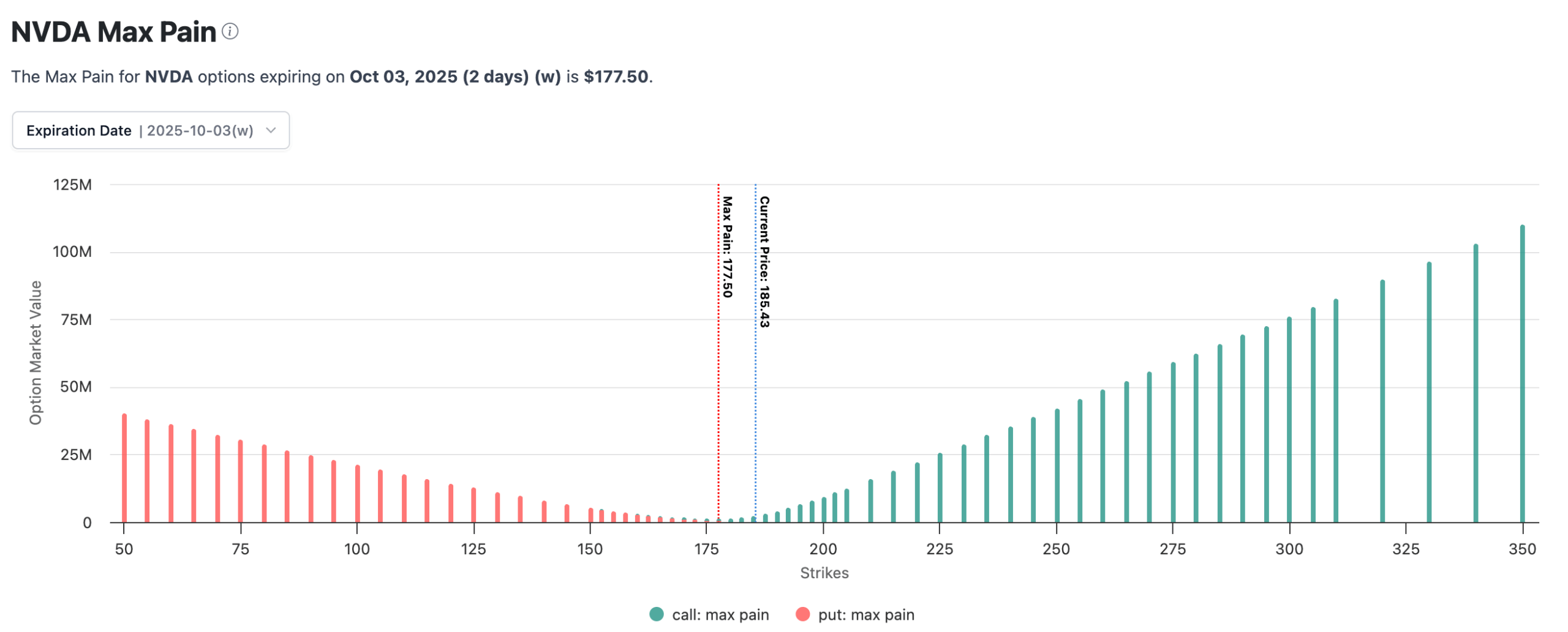 180ドル、182.5ドル、185ドルに集中するコールの建玉が下支えとして機能し、ディーラーのヘッジ取引(デルタ調整)が株価の反発を促しやすいと考えられます。マックスペインの上限である177.5ドルへの引力も意識され、買い下がりのポイント。