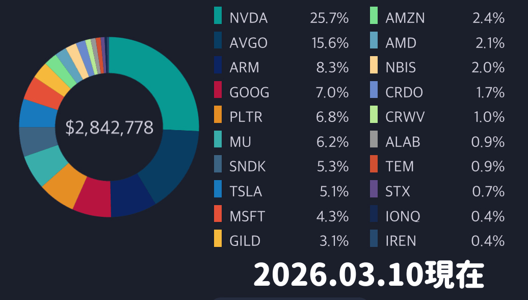 米国株を中心に、AI・半導体関連を軸としたポートフォリオです。