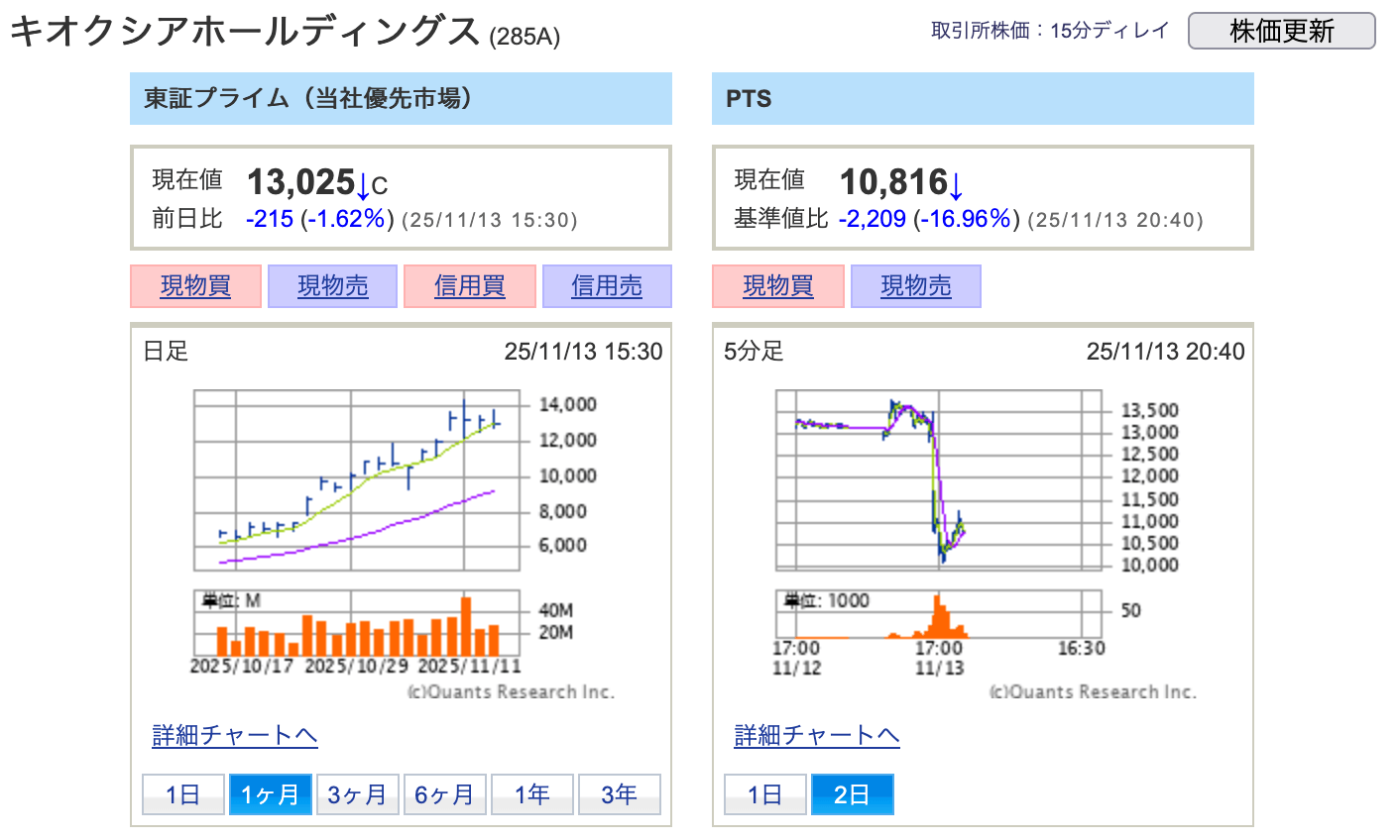 キオクシアが決算を受けてPTS(時間外取引で一時▲20%超の)暴落し、ネオクラウド銘柄(CRWV、NBIS、IREN)も同様に決算後に調整局面を迎えています。