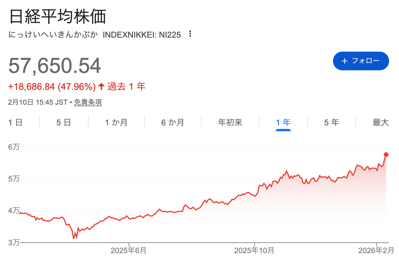 そもそも直近1年で振り返ってみても、日経平均株価は+50%も上昇し、現在57,000円台で推移しています。