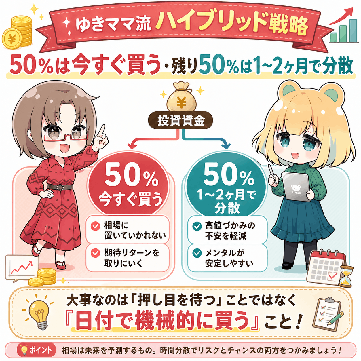 ✔︎ゆきママ流ルール:資金の50%は今すぐ買い、残りを1〜2ヶ月で分散