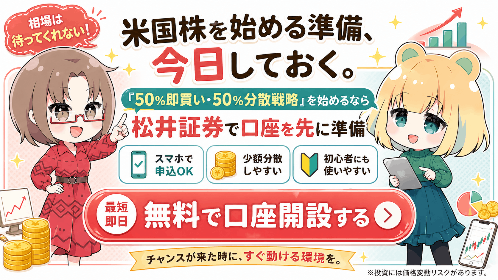 相場は待ってくれません。まずは口座を開設し、無理のない範囲で『最初の一歩』を踏み出してみてくださいね!
