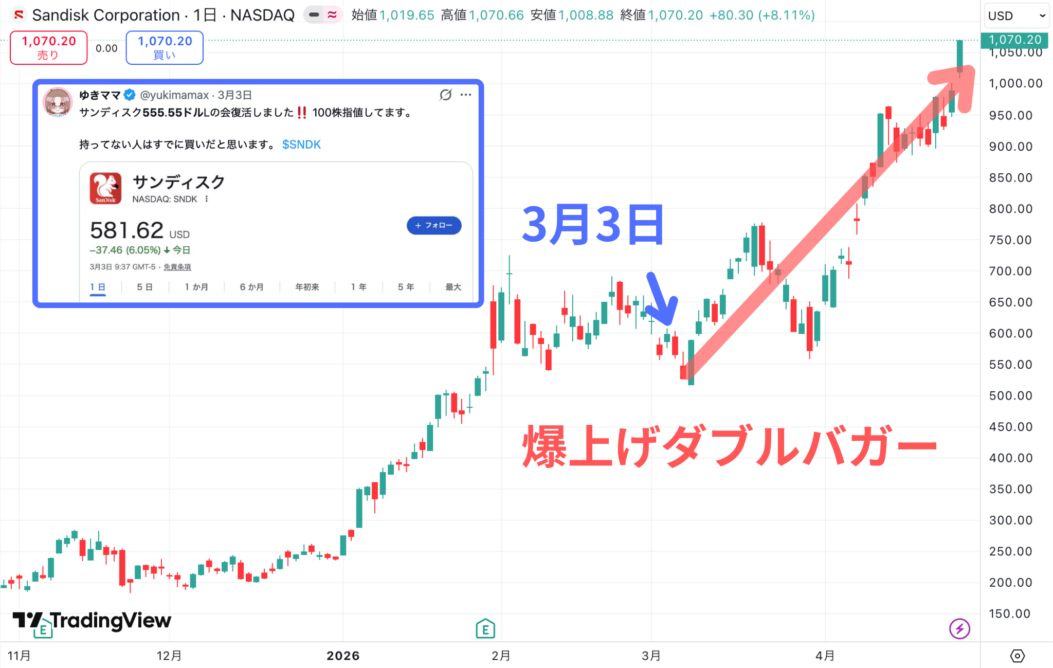 実は、先月に555.55ドルでナンピン買いしたサンディスク(SNDK)が、すでに1,000ドルを大きく超えてダブルバガー(2倍)水準を達成しています。