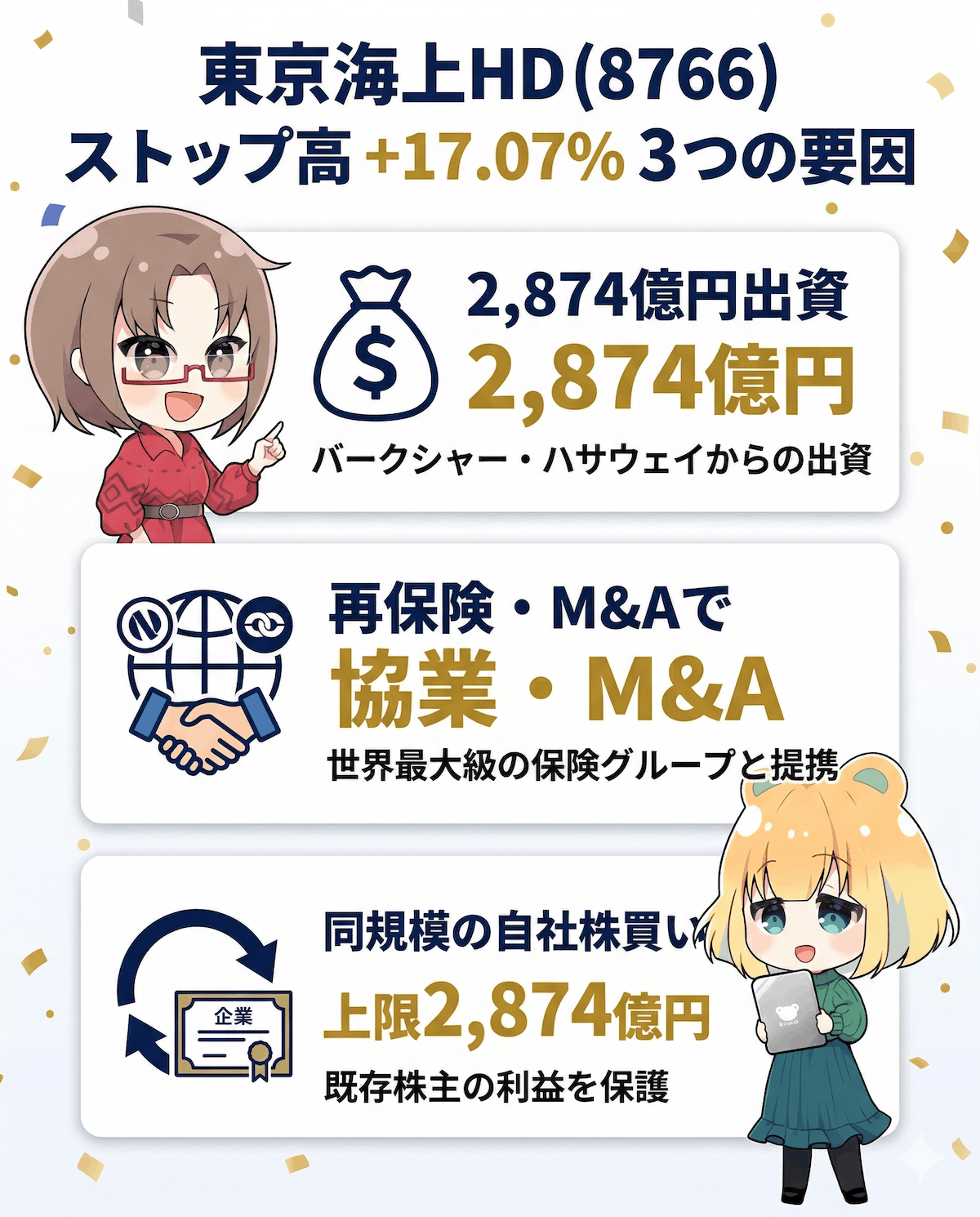 今回の出資は、東京海上HDが保有する金庫株(自社株)を割り当てるスキームです。通常、新たな出資を受け入れると1株あたりの価値が薄まるリスクがありますが、東京海上は同時に『上限2,874億円の自社株買い』を発表しました。バークシャーからの資金受け入れと同規模の株を市場から買い戻すことで、既存株主の利益を完璧に守ったと言えるでしょう。