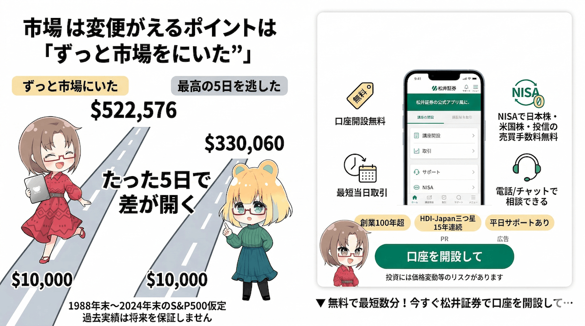 そして、そのわずかな反発局面を逃すだけで、長期的なリターンは大きく変わってしまいます。