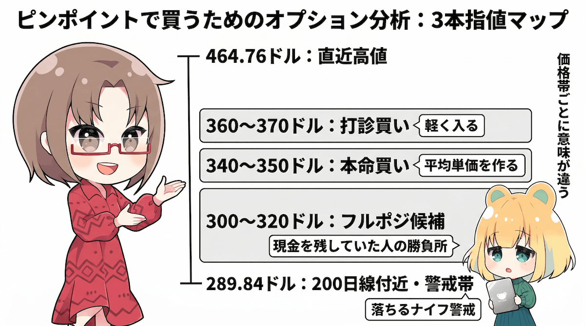 ② 第2指値340〜350ドル:直近高値(464.76ドル)から約25%下落した水準です。ここまで来れば、ニュースや需給悪化によるオーバーシュート(行き過ぎ)の可能性が高く、長期目線の現物買いとしてはかなり魅力的な平均取得単価を作れます。