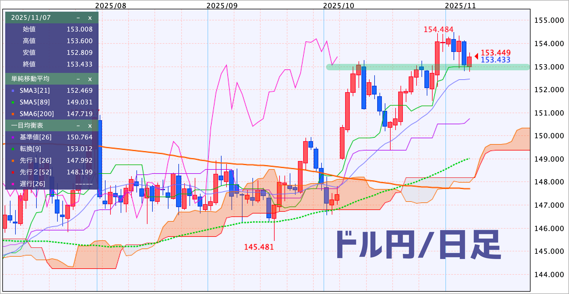 10月29-30日の日米金融政策イベントをトリガーに、ドル円は153円のレジスタンスラインを明確に上抜け、154円台に乗せました。現在は、抜けた153.00円ラインがサポートとして機能していると見られ、大きな材料が出なければ153円台での値動きが続くと想定されます。