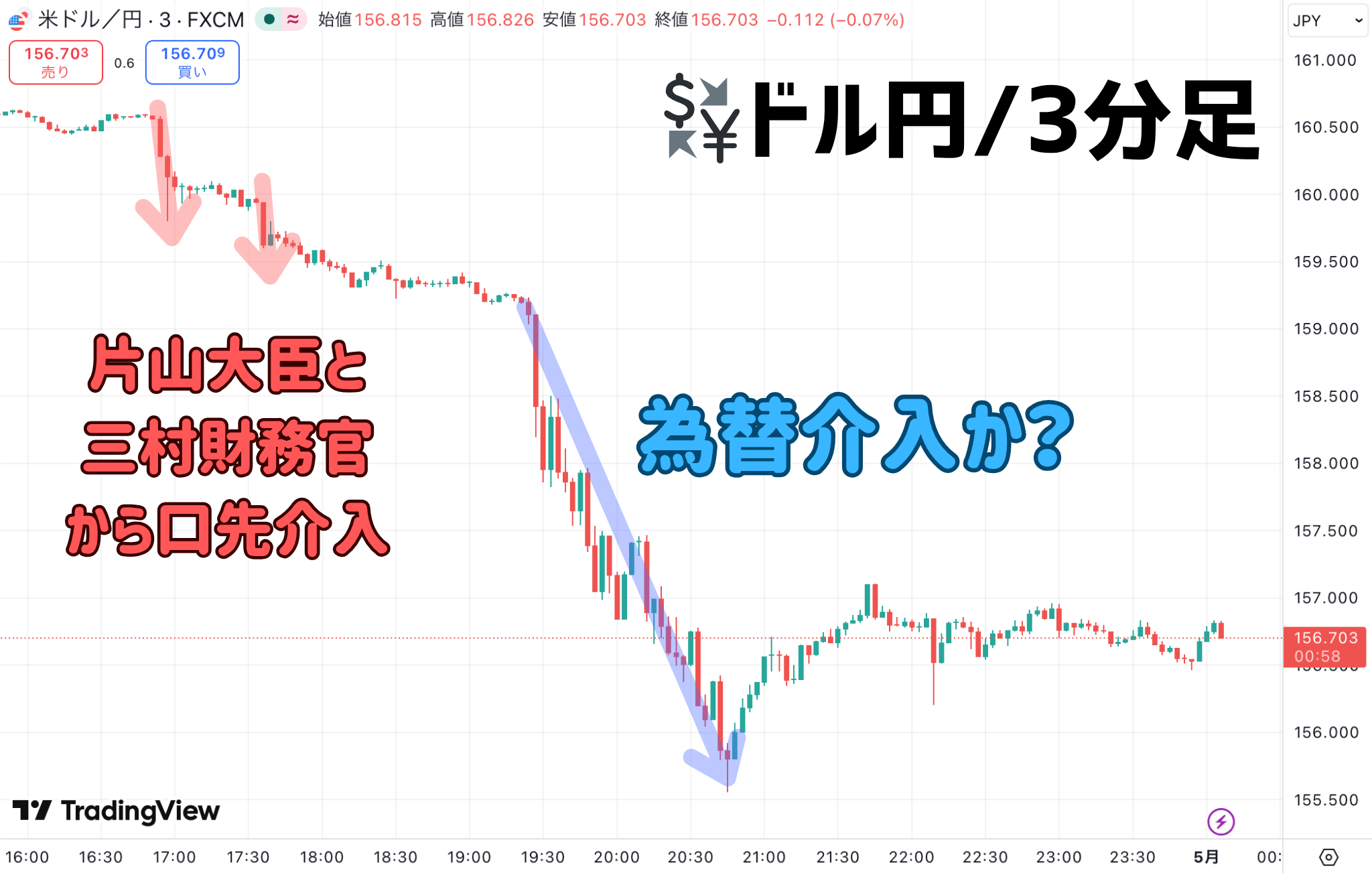 このように当局から非常に強いけん制、実質的な最後通牒がありましたから、おそらく為替介入だったのでしょう。ドル円はこの日の高値160.70円レベルから、発言後に159.50近辺へ、さらにその後、155.50円台まで急激に円高が進みました。