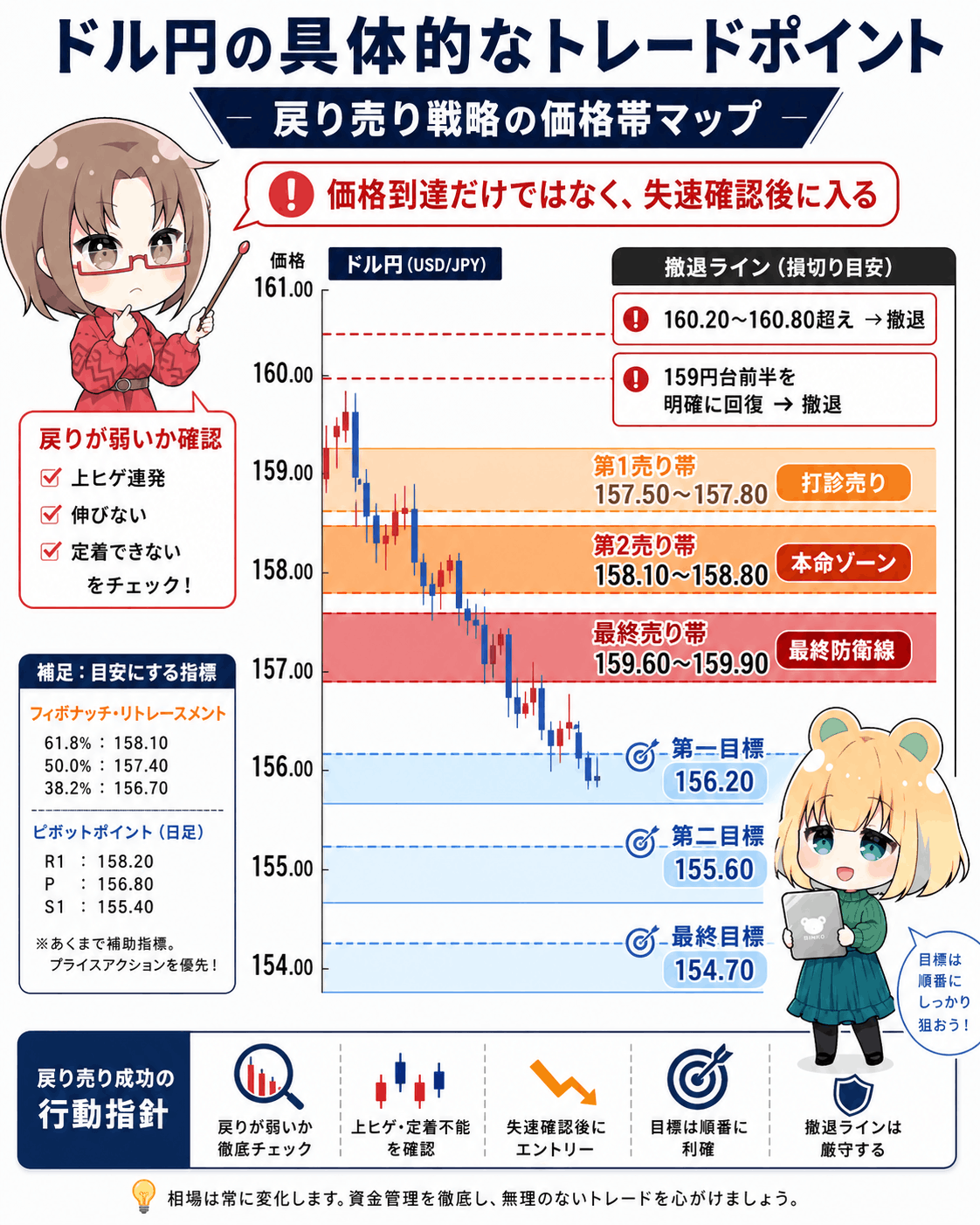 ・157.50〜158.80円で売った場合:159円台前半を明確に回復したら一度撤退。
