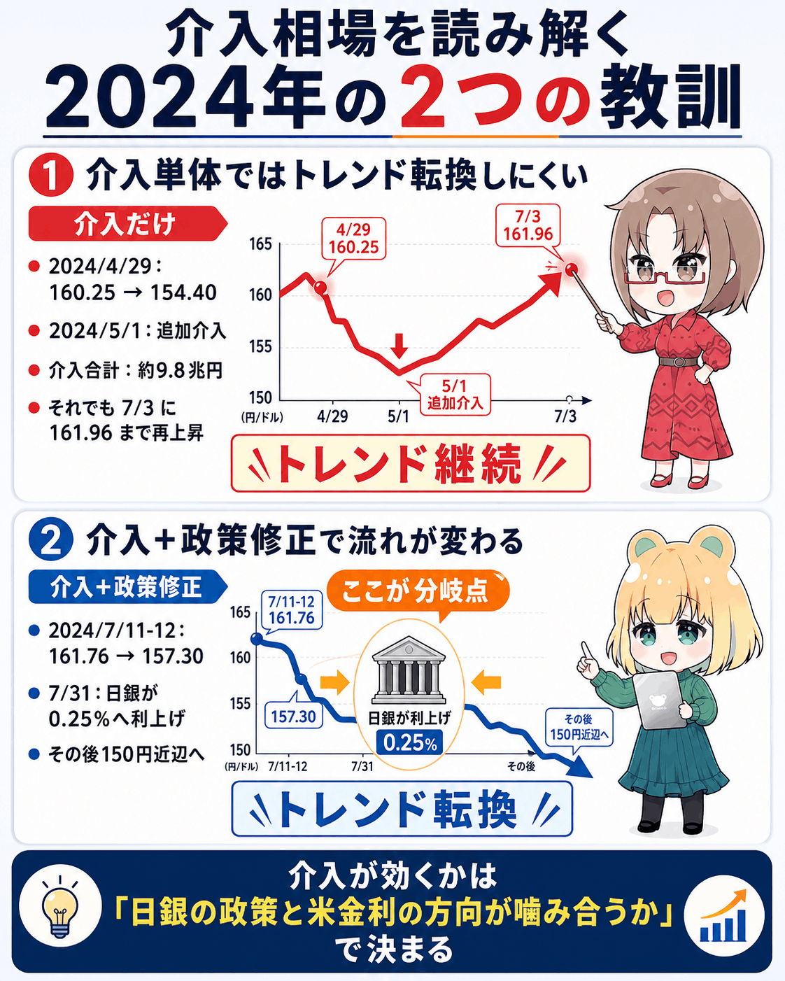 つまり、2024年の本当の教訓は、介入が相場に効くかどうかは『日銀の政策と米金利の方向が噛み合うかで決まる』という点にあります。