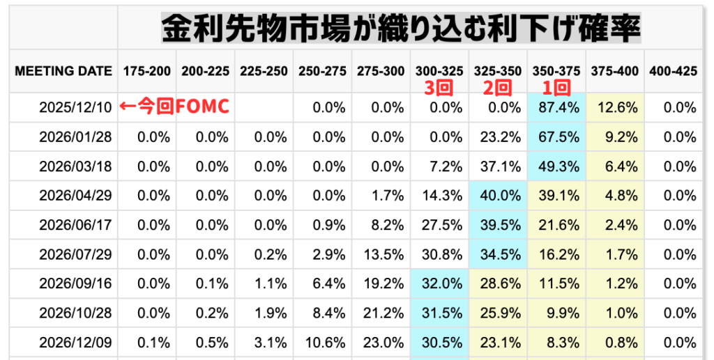 ご覧のように今回の利下げを87.4%織り込んでいます。したがって、今週の相場を左右するのは『今回利下げが行われるか否か』ではなく、以下の2点に集約されます。①ドットプロット(政策金利見通し)の変化:特に注目すべきは2026年の利下げペースです。