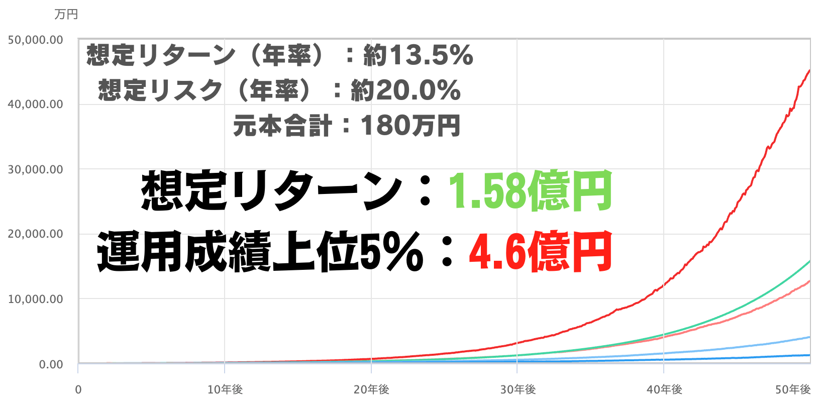 想定では約1.58億円、上位5%の上振れを引けば4.6億円となります。下位5%の下振れとなると1,300万円にしかなりませんが、投資元本は月3,000円×600ヶ月=180万円ですから、大成功でしょう。