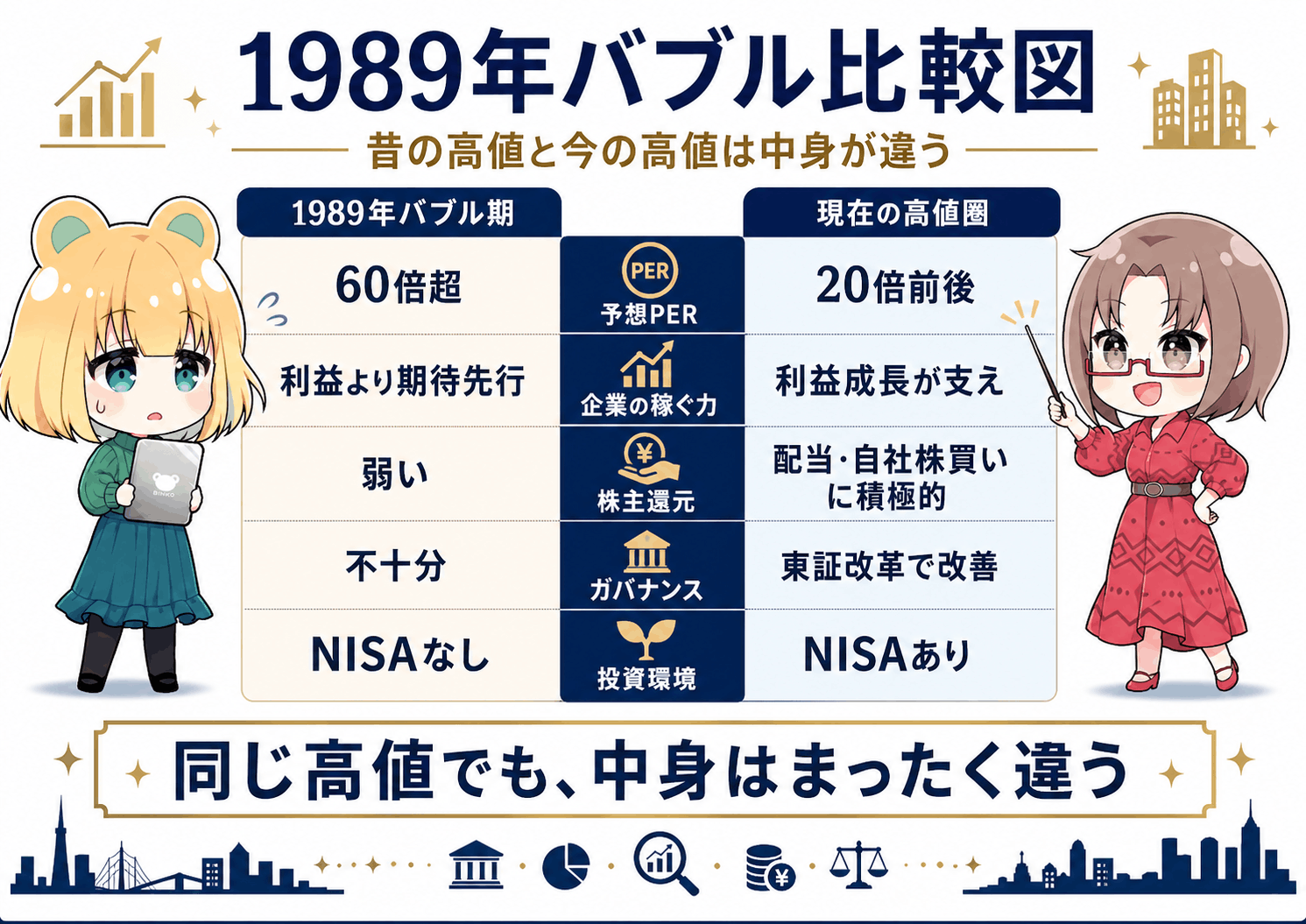 しかし、当時の『3万8千円』と今の『6万円』では、その中身が全く異なります。 ここが理解できれば、今の株価が決して『根拠のないバブル』ではないことが分かります。