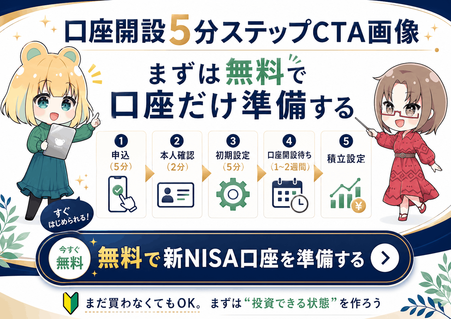 『何をどれだけ買えばいいか』は、口座が開設されるまでの間にゆっくり考えれば大丈夫です。まずは『口座という器』を作らない限り、1円も増えることはありません。