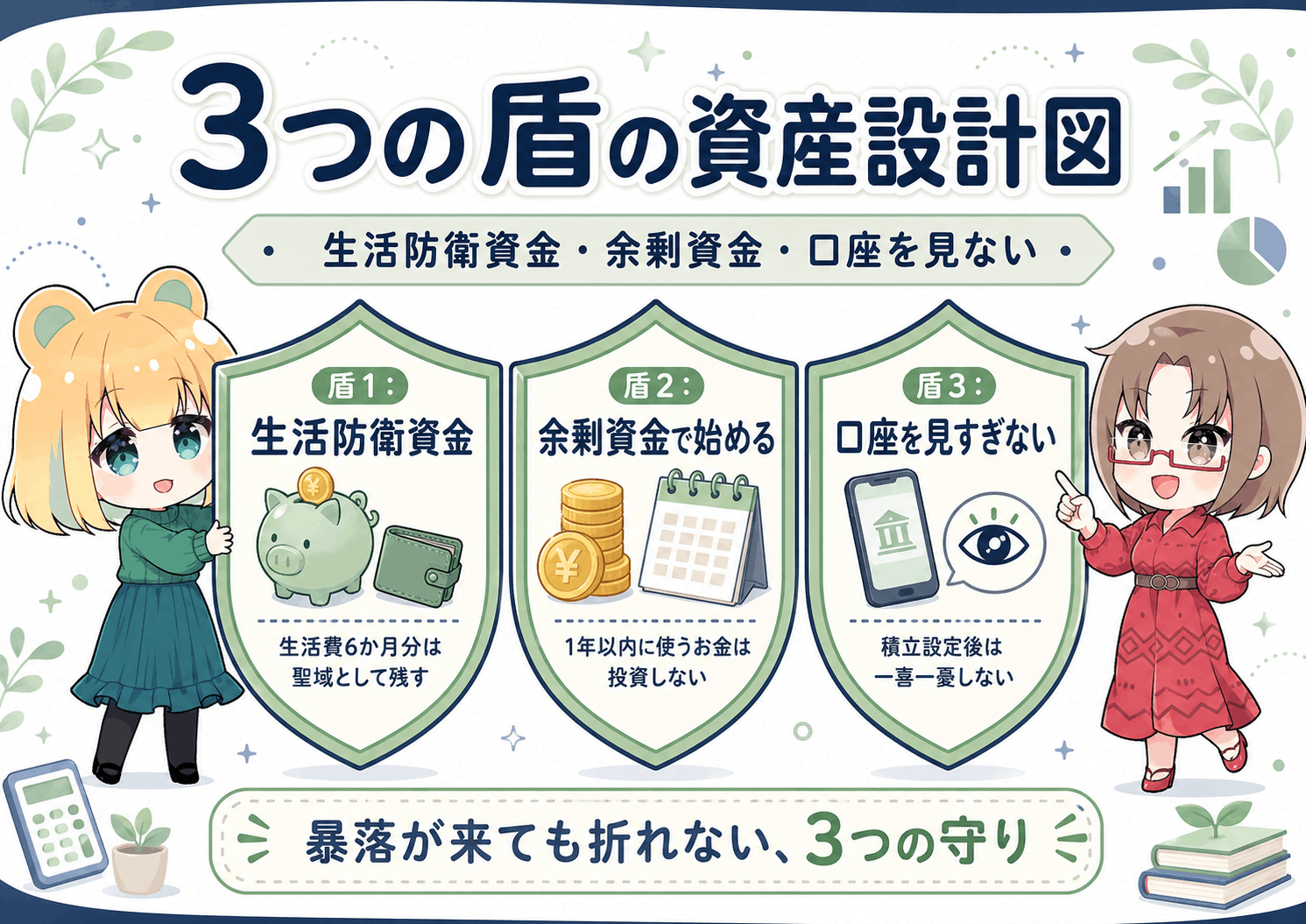 そんなあなたのために、暴落が来ても心が折れない『3つの盾』を用意しましょう。これさえ守れば、明日日経平均が4万円に暴落しても、あなたは笑っていられます。