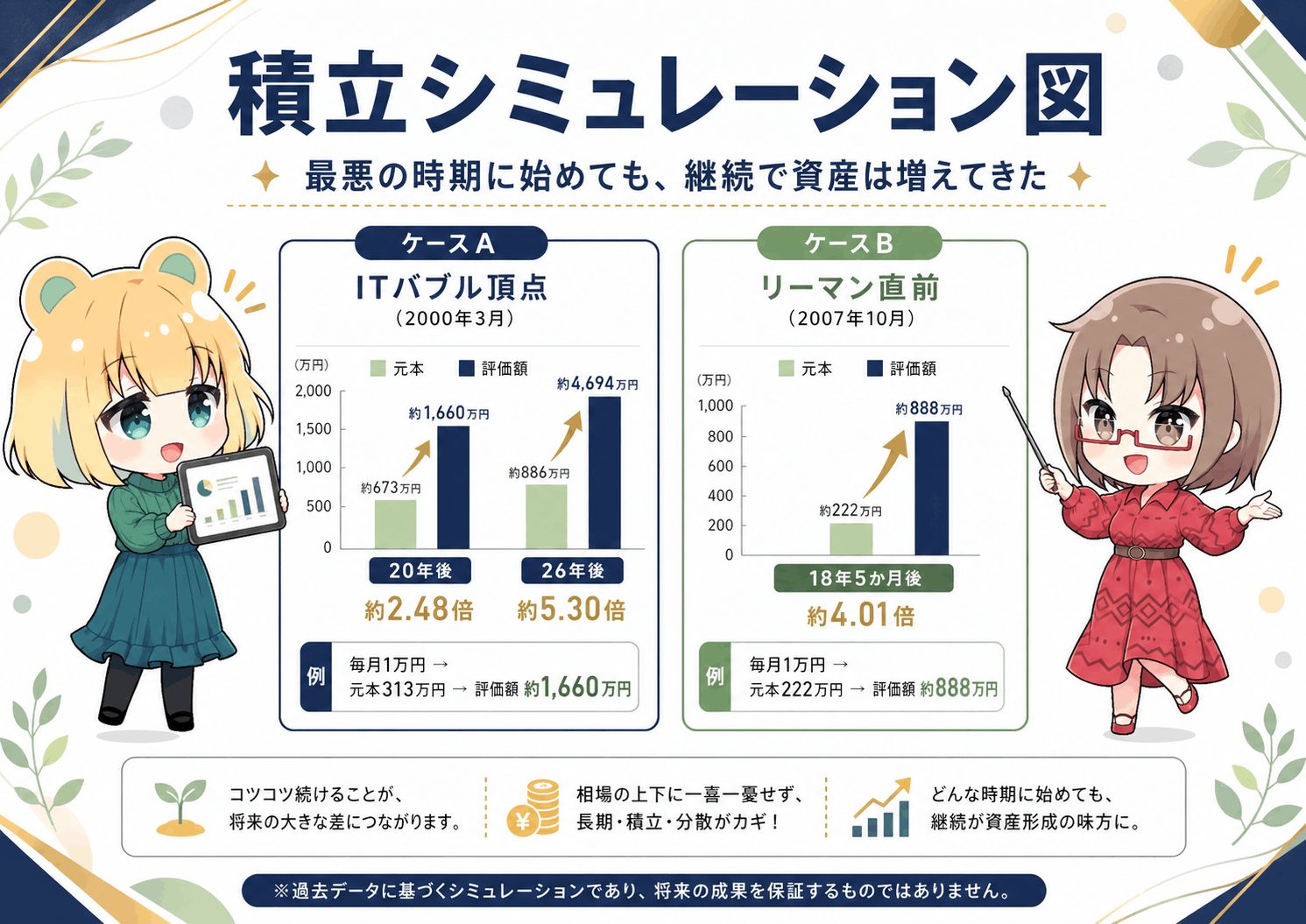 積立投資という手法を取る限り、スタート地点が5万円だろうが6万円だろうが、10年後、20年後の結果に与える影響は驚くほど軽微で、必ず報われてきました。