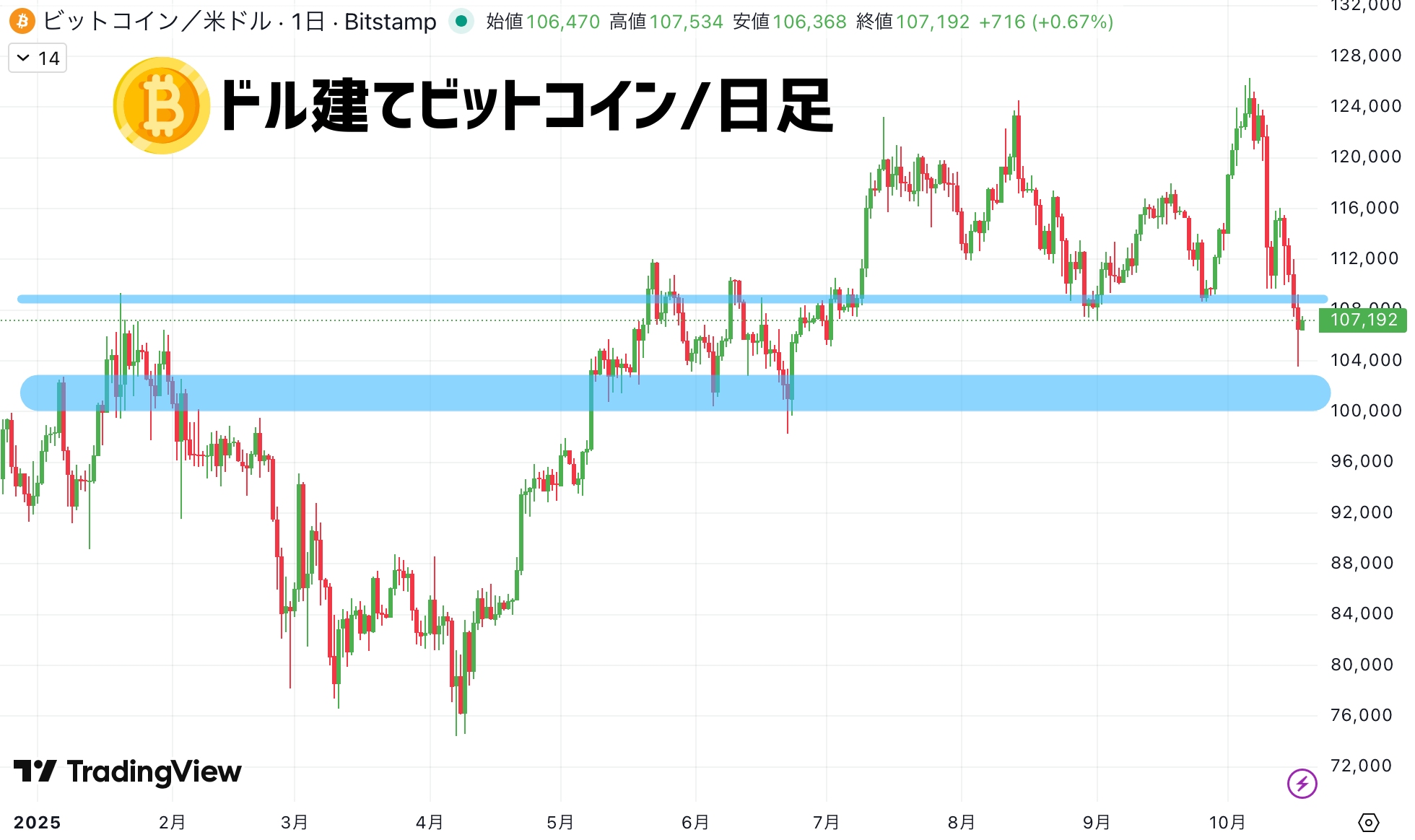 10万ドルは重要な心理的節目であり、ここを割り込むと売りが連鎖するリスクが高まります。