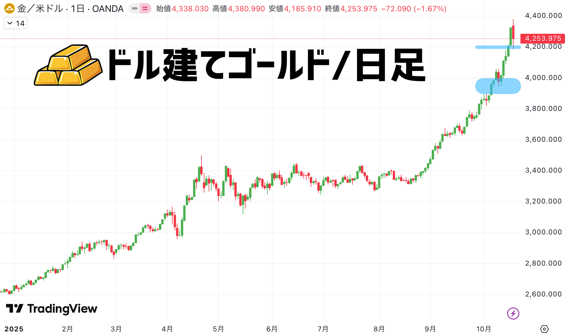 特に、10月17日には米国の銀行セクター不安などを背景に、安全資産としての金の需要が急増。金価格は一時1オンス=4,379ドルまで急騰し、史上最高値を更新しました(日本時間18日未明時点では4,240ドル前後で推移)。