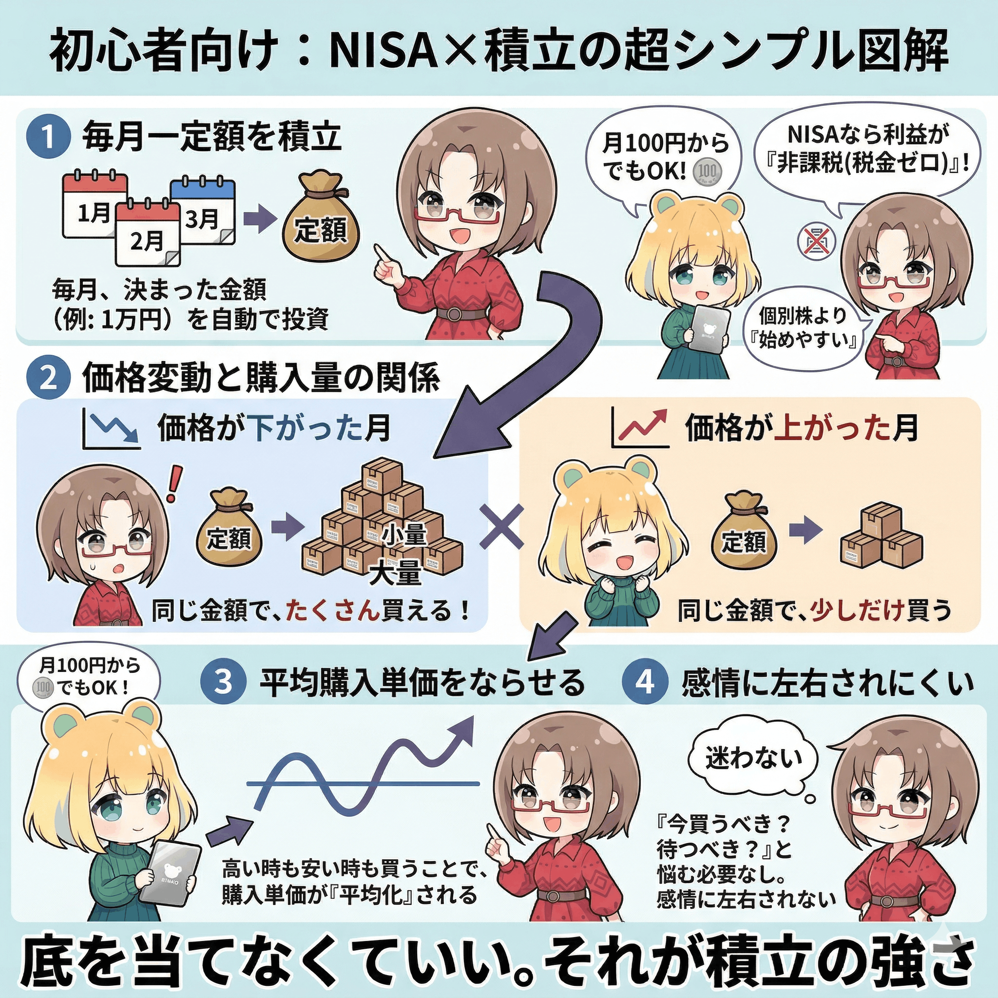 株価が下がったり、急激な円高になれば元本割れするリスクは当然あります。だからこそ『一気に大金』ではなく、『少額をコツコツ長期間』続けることが、リスクを抑える最大のコツです。