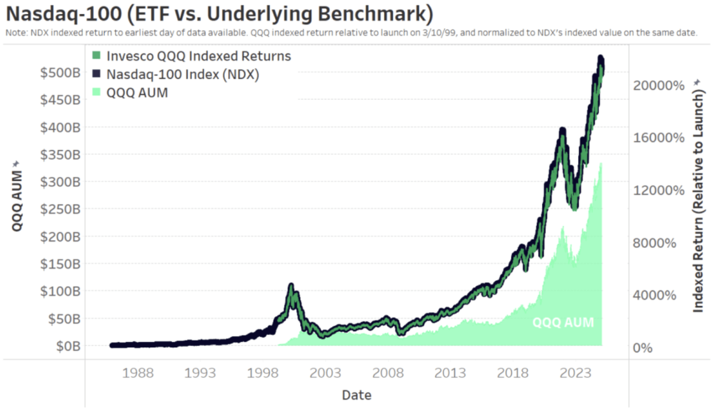 たとえば、NASDAQ公式が公開している資料を見ると、ナスダック100は算出開始(1985年)以降、2024年末までに約+20,000%(約200倍)をはるかに超えており、複利年率にすると約14.25%となっています。