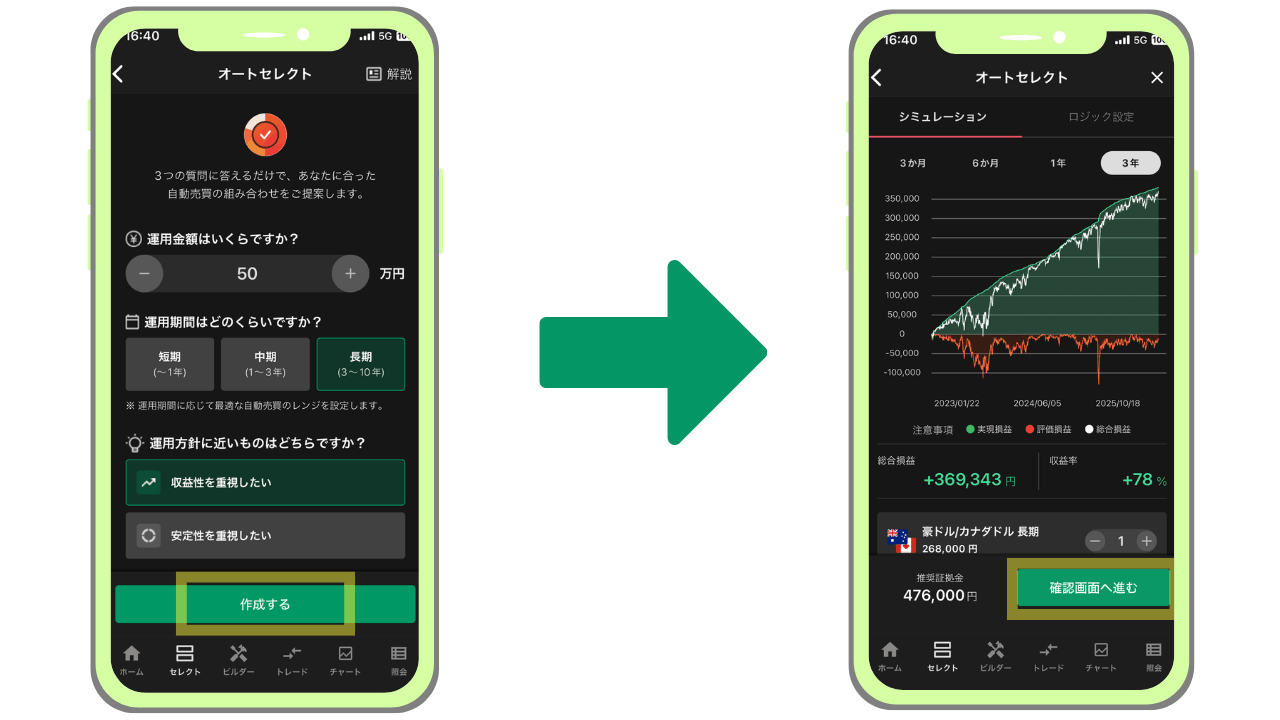 さらに最近では、『オートセレクト』といって、3つの質問(運用金額・運用期間・運用方針/2択)に答えるだけで、自動売買の組み合わせを提案してくれる独自の判断機能もリリースされました。