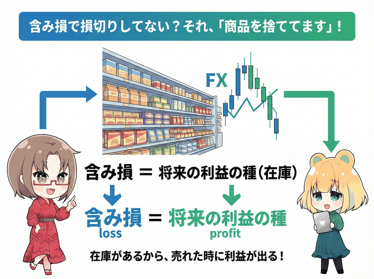 つまり、含み損を抱えている状態は『安く仕入れた在庫を持っている状態』。これを損切り=「仕入れた商品を捨てる」ことになります。